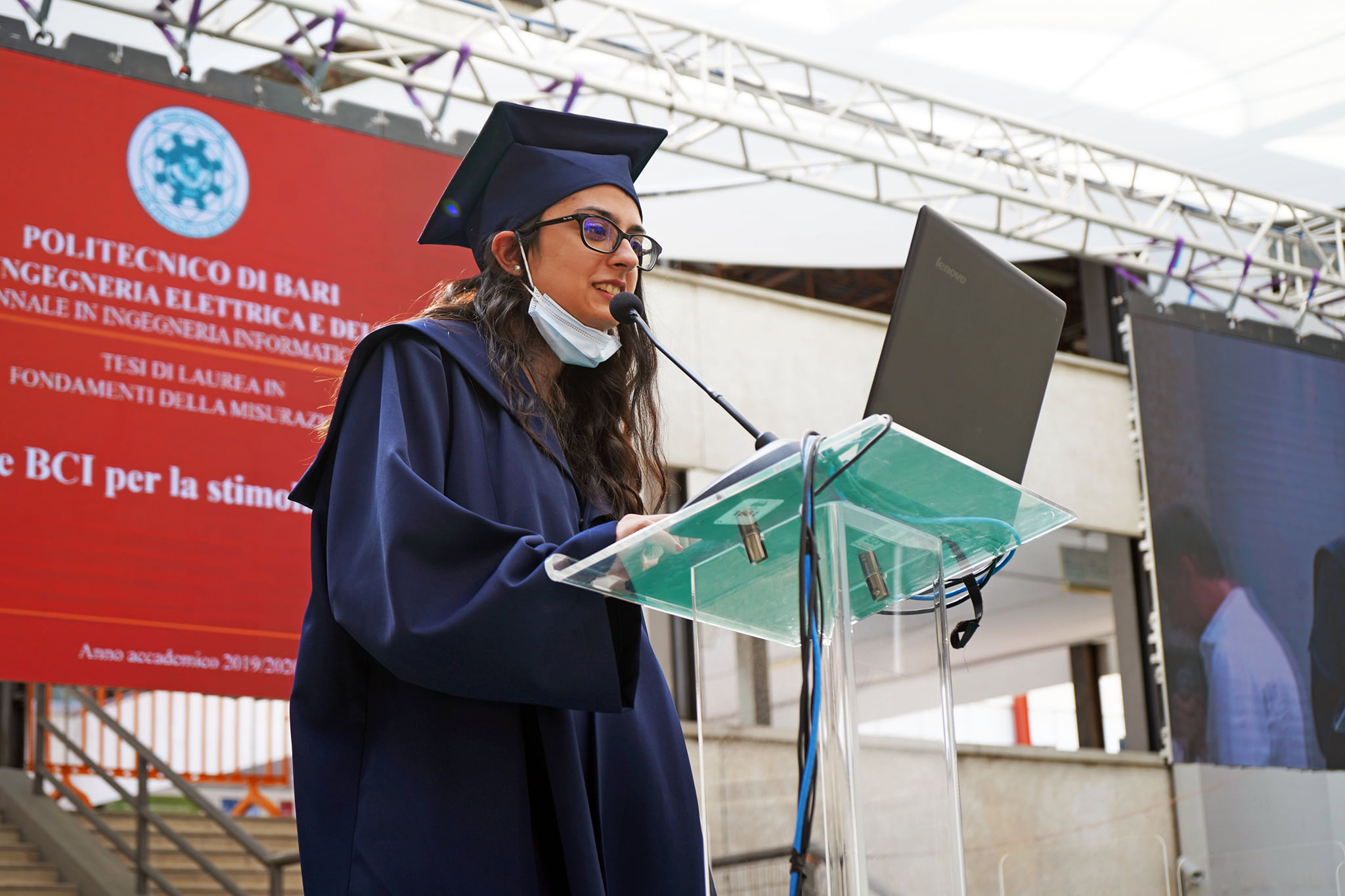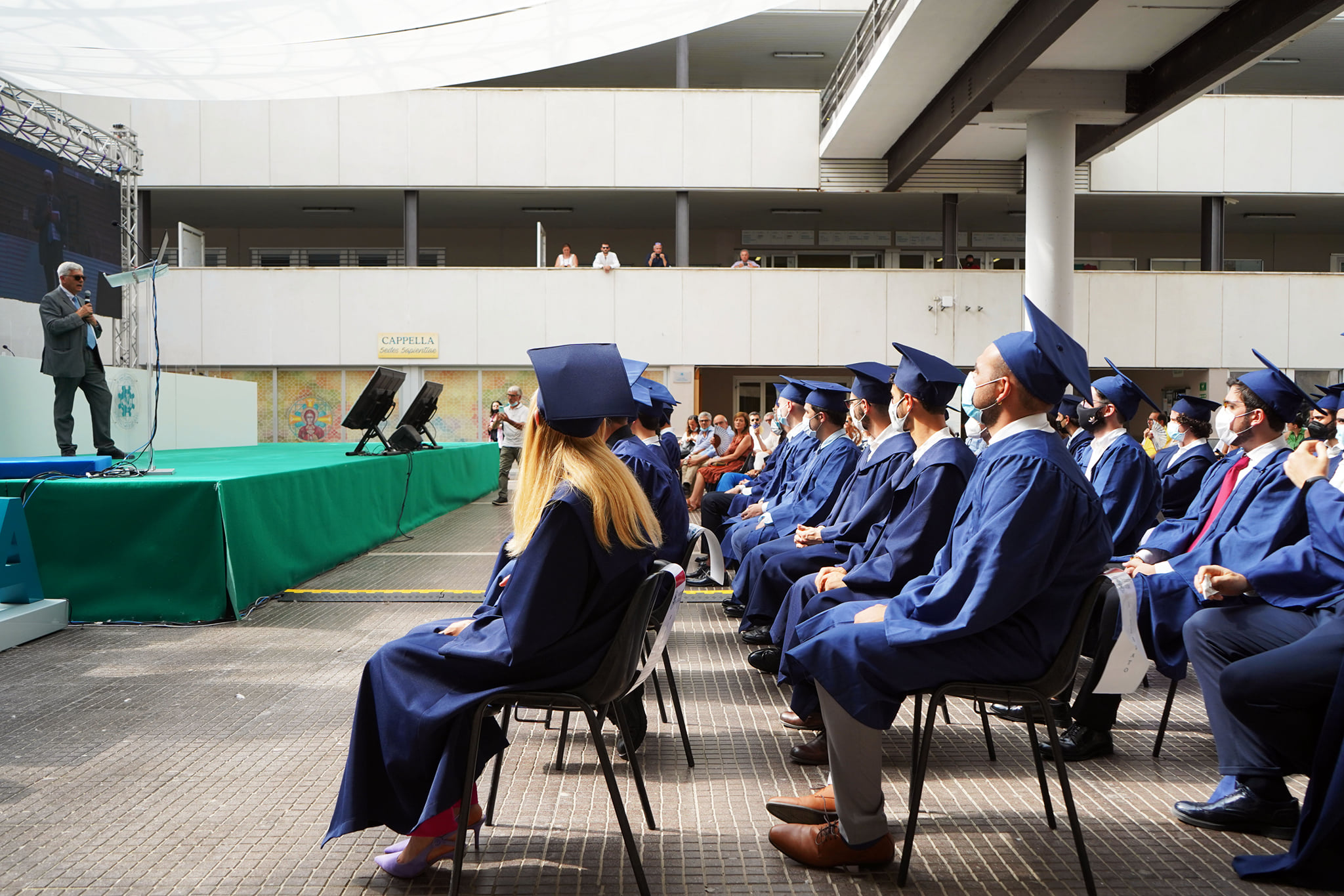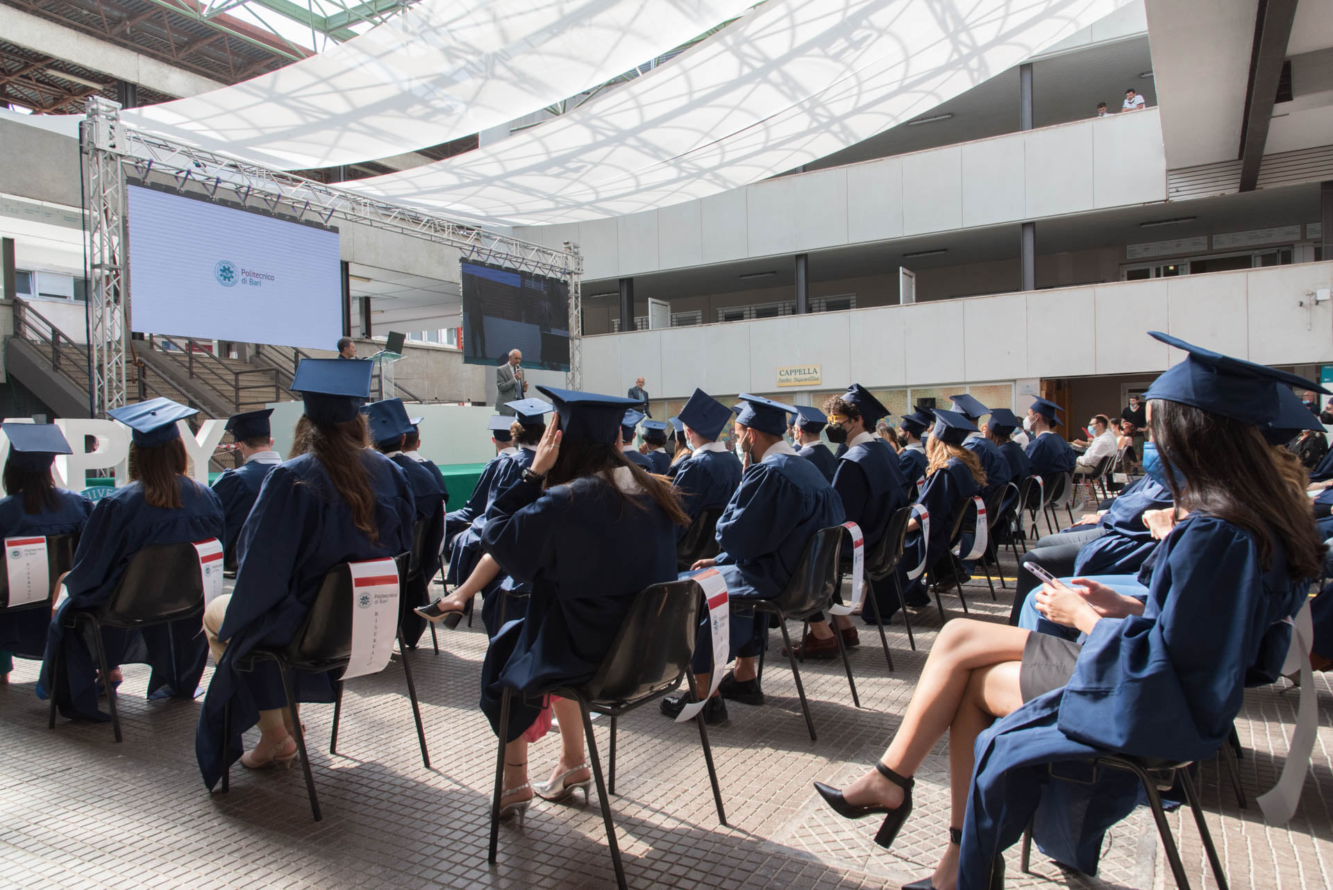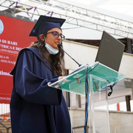 I laureandi hanno discusso le proprie tesi nell’atrio coperto “Cherubini”, su un palco attrezzato con maxischermo per la proiezione delle slide e sul quale hanno preso posto anche le commissioni. La stessa organizzazione ha caratterizzato i Graduation Days del 12, 13, 15 e 16 luglio scorsi, quattro giornate dedicate alla consegna delle pergamene ai ragazzi che si sono laureati da remoto, in videocollegamento, durante il periodo di zona rossa e delle restrizioni agli eventi in presenza.
