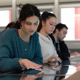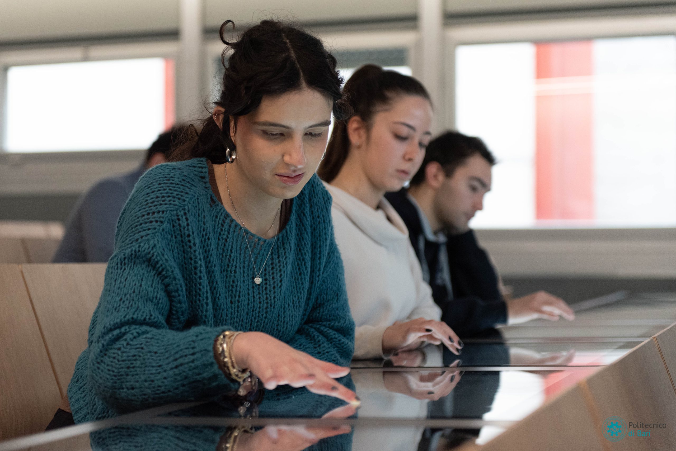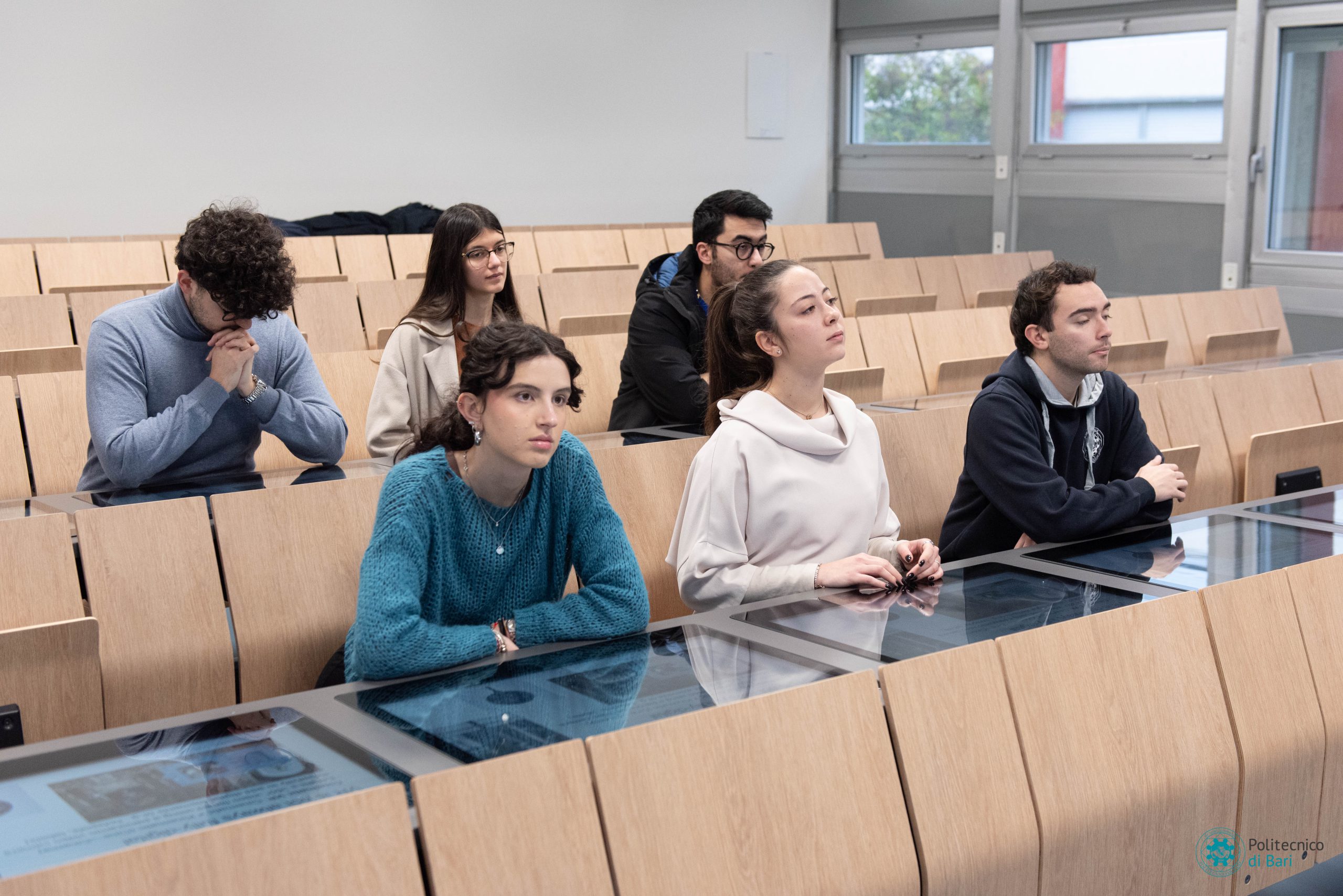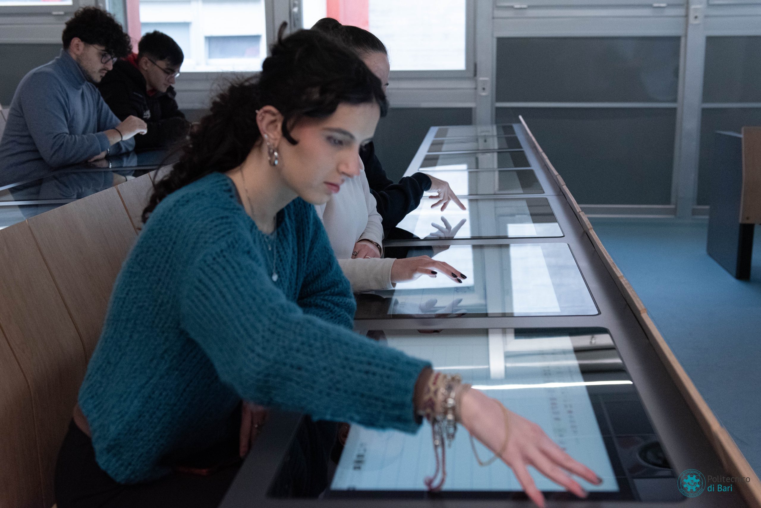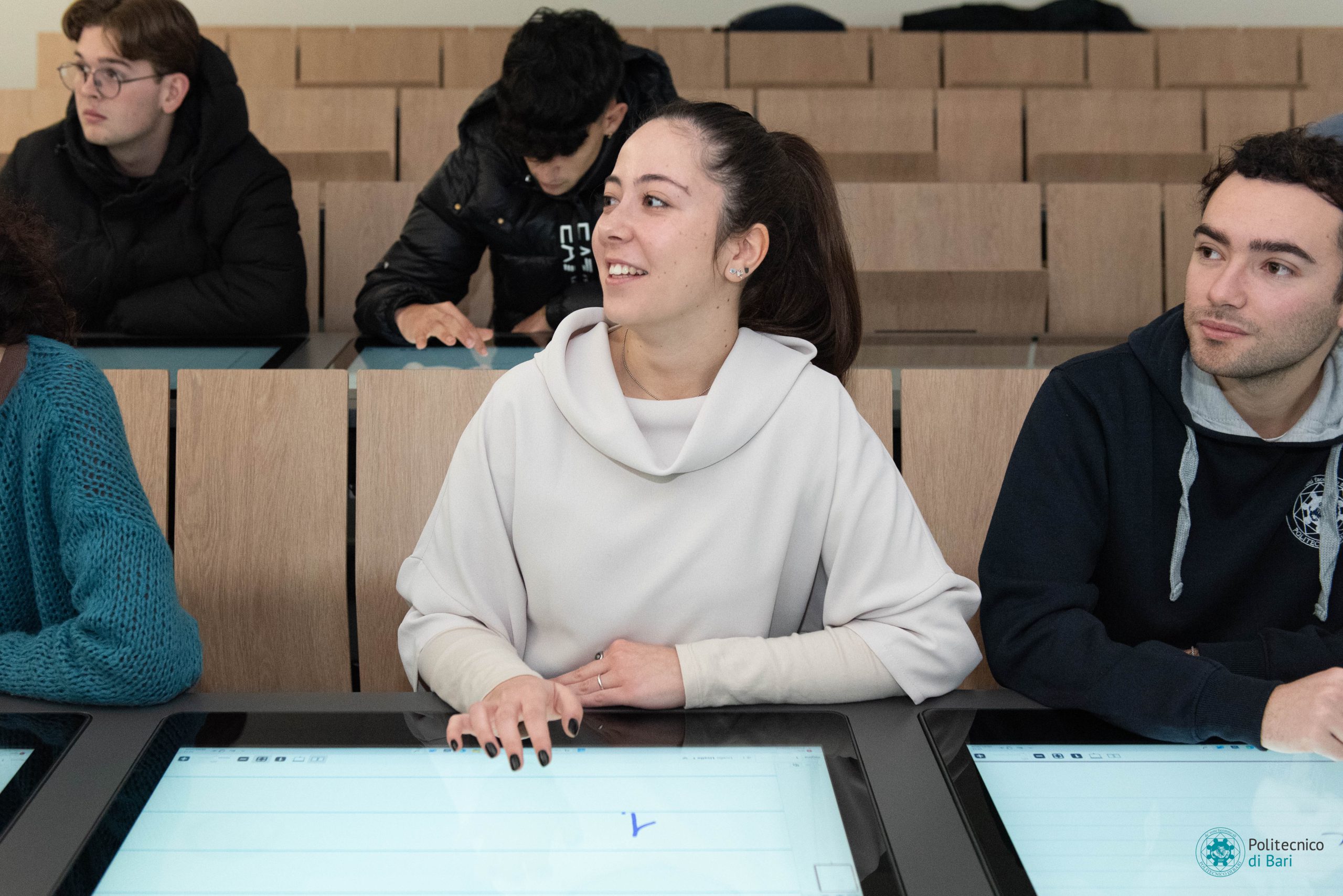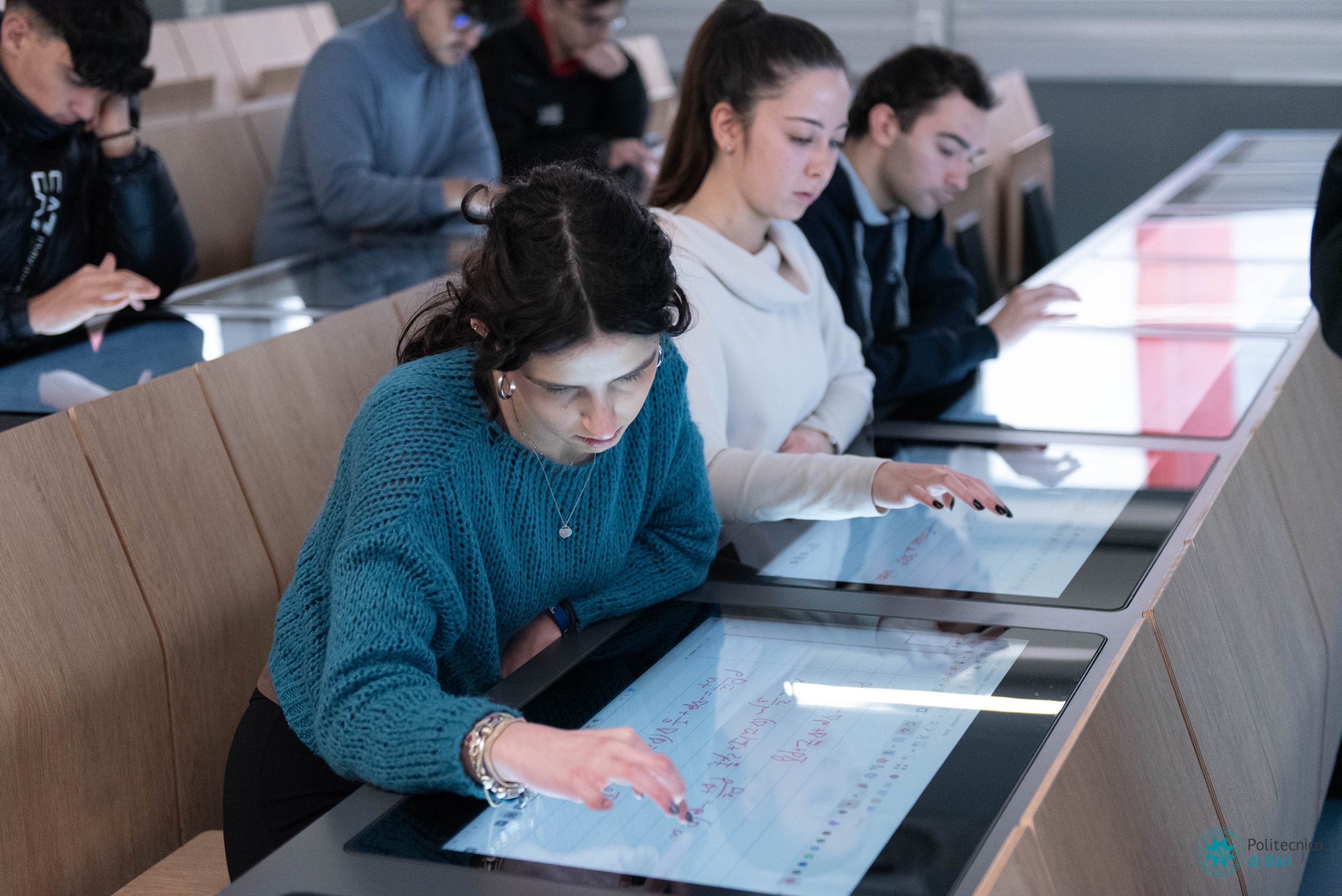 Ogni postazione nelle nuove aule digitali del Politecnico di Bari è dotata di uno schermo multitouch da 27 pollici integrato nel banco e collegato ad un minicomputer, anche questo integrato. Sono presenti anche postazioni per disabili. La postazione docente è composta da uno schermo da 55 pollici e una workstation progettata per l’utilizzo dell’intelligenza artificiale e la grafica professionale, regolabile elettronicamente in altezza e nell’inclinazione. Completa la postazione docente una lavagna interattiva da 86 pollici, con funzioni smart di secondo schermo, navigazione web, appunti su schermo.