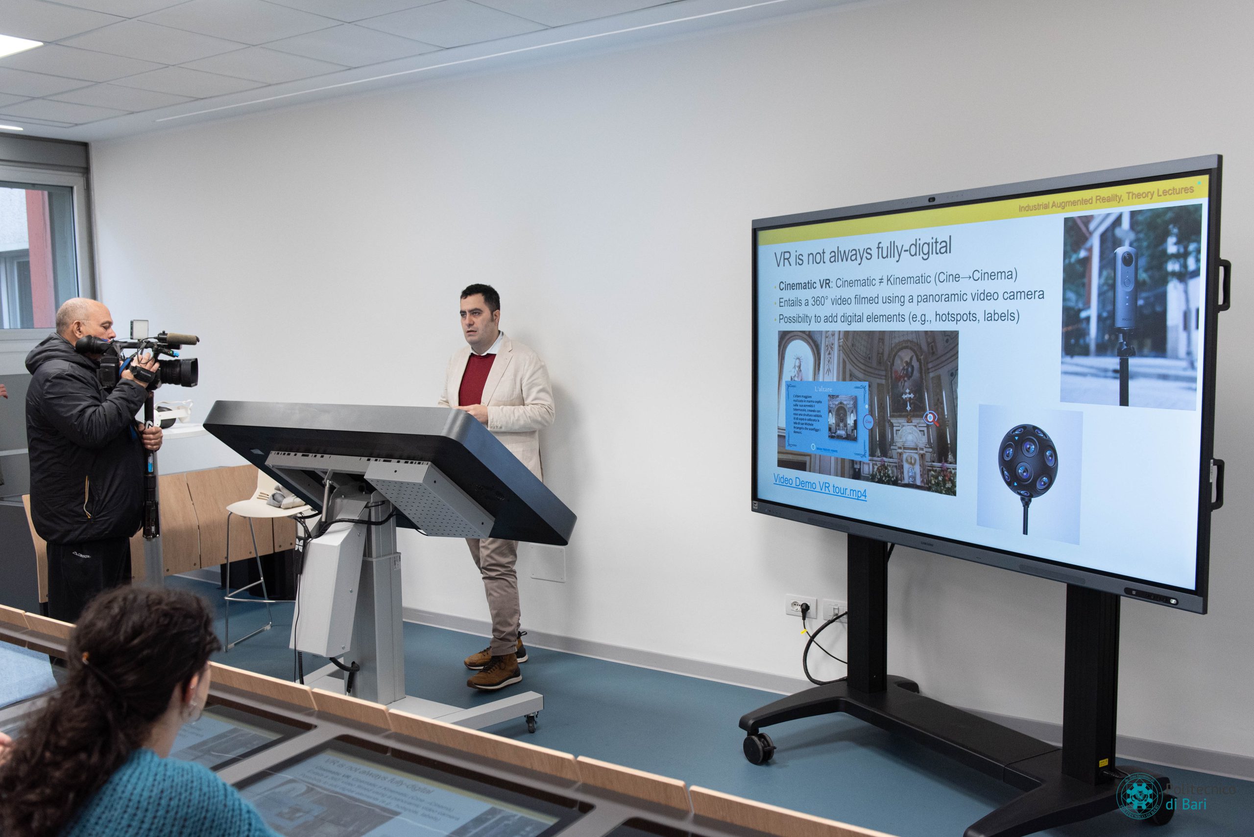 Oggi il rettore del Politecnico di Bari, Umberto Fratino, ha presentato le nuove aule digitali dell’ateneo. Lavagne, proiettori e supporti cartacei escono di scena e vengono sostituiti da postazioni interattive con schermo multitouch, visori, software per la grafica professionale e sistemi di intelligenza artificiale. Anche la cattedra del docente viene sostituita da una postazione di controllo, collegata alle postazioni degli studenti e ad un sistema audiovideo con regia automatizzata, per collegamenti a distanza, videoconferenze e condivisione di contenuti multimediali in tempo reale.